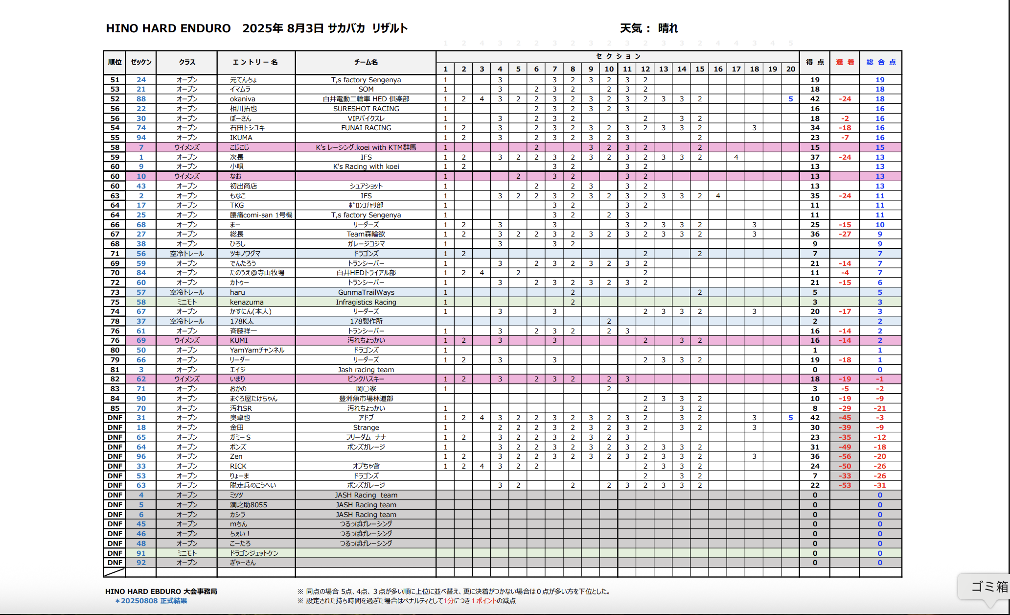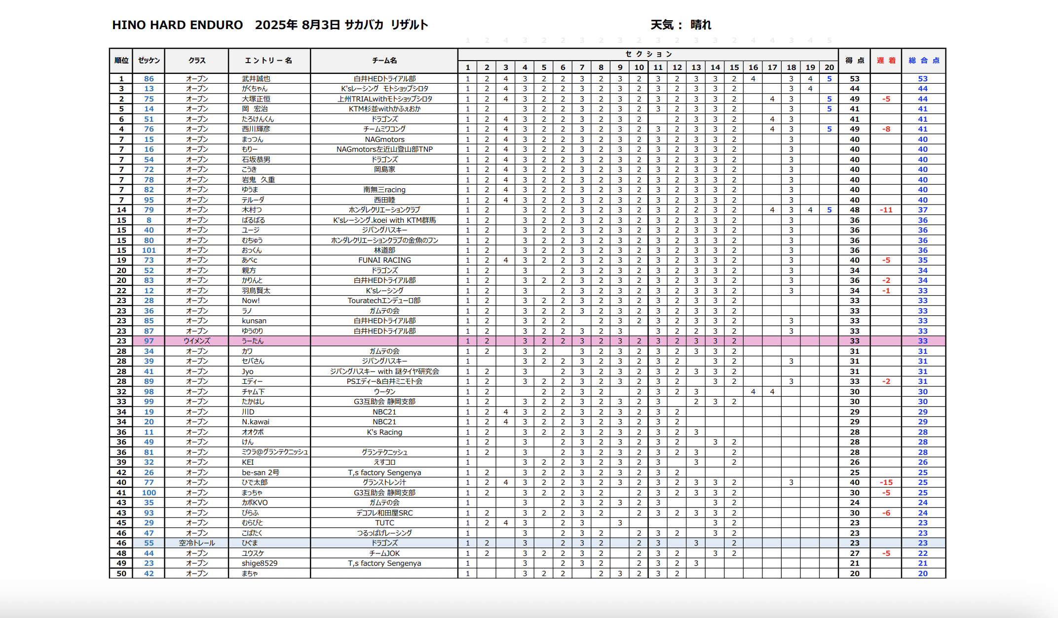 サカバカ2025リザルト発表! Posted on 2025年8月3日Updated on 2025年8月9日by kuritaカテゴリー:レースリザルト サカバカ2025参加の皆様、暑い中ご参加頂きありがとうございました。 精査したリザルトを発表いたします。 赤字の点数は間違った点数が書き入れられていたのを修正したものです。 ※8/9リザルト修正済 総合リザル ミニモトクラス 空冷クラス ウイメンズクラス オープンクラス kurita